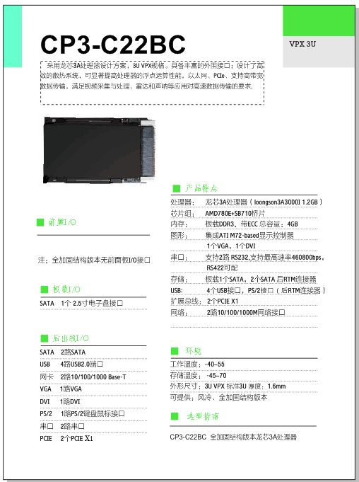 采用龍芯3A處理器設(shè)計(jì)方案,3U VPX規(guī)格。具備豐富的外圍接口;設(shè)計(jì)了高